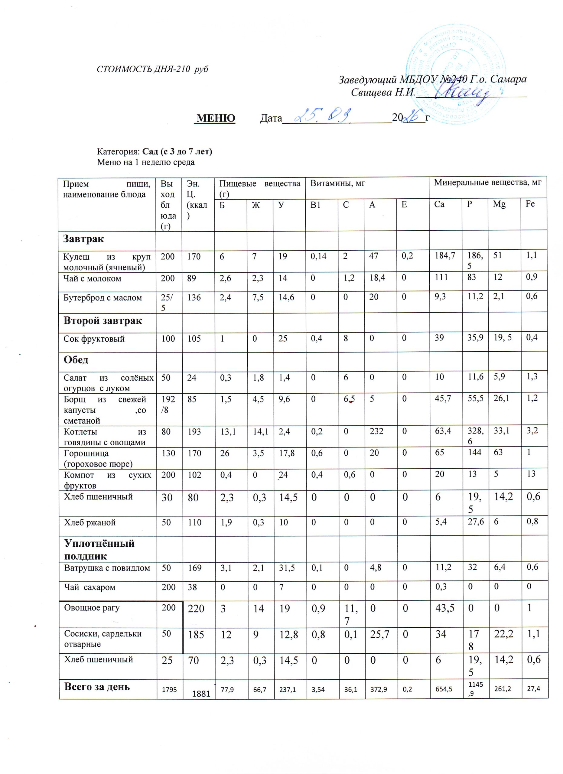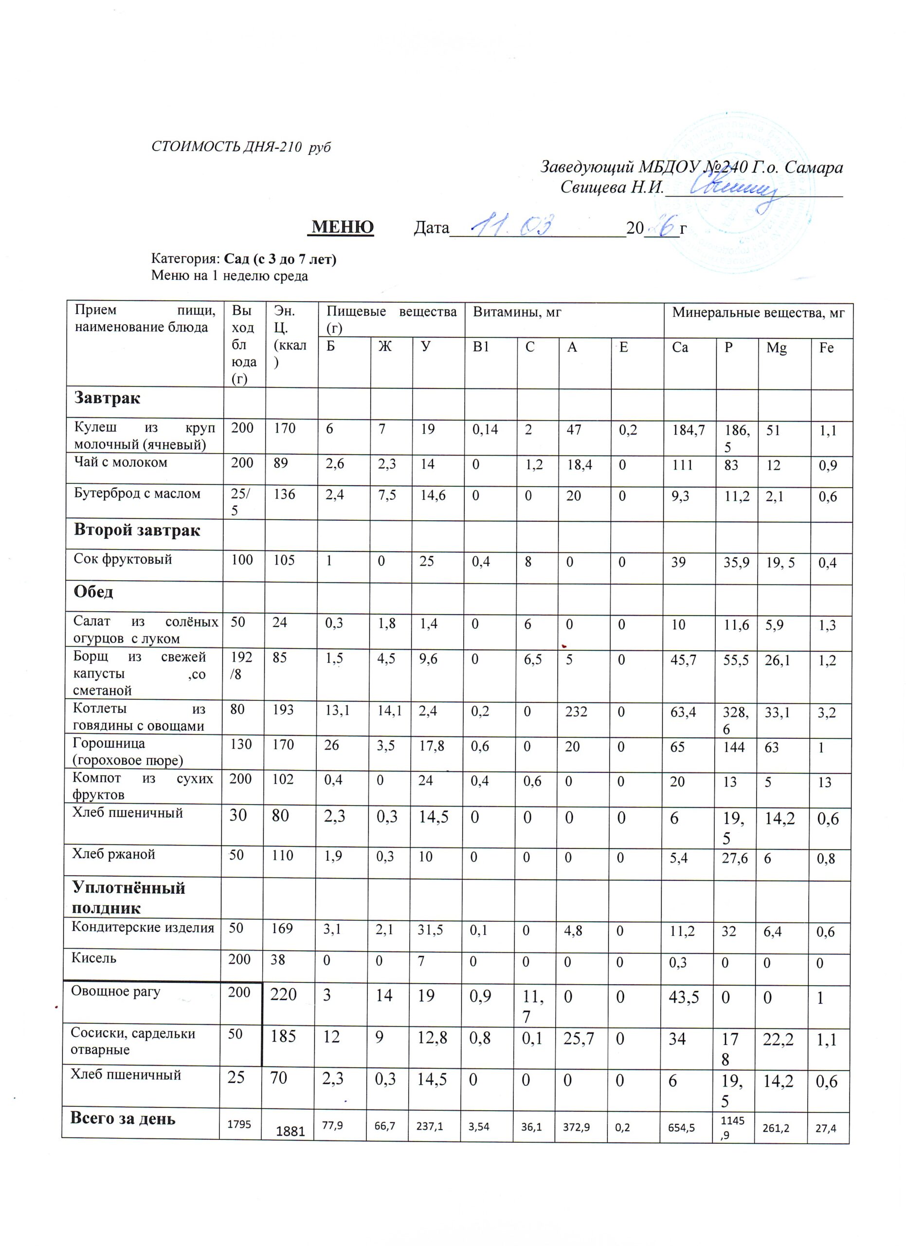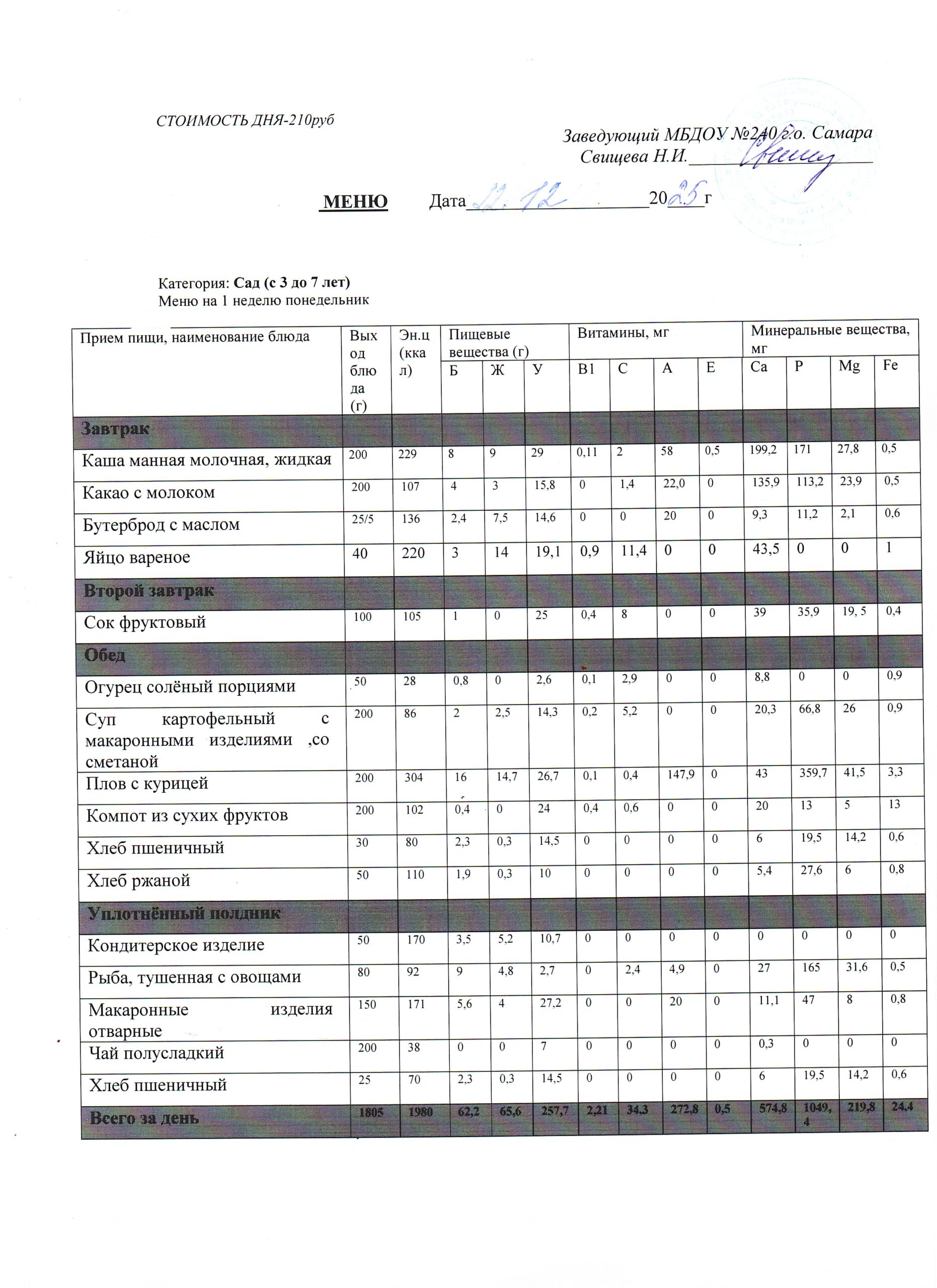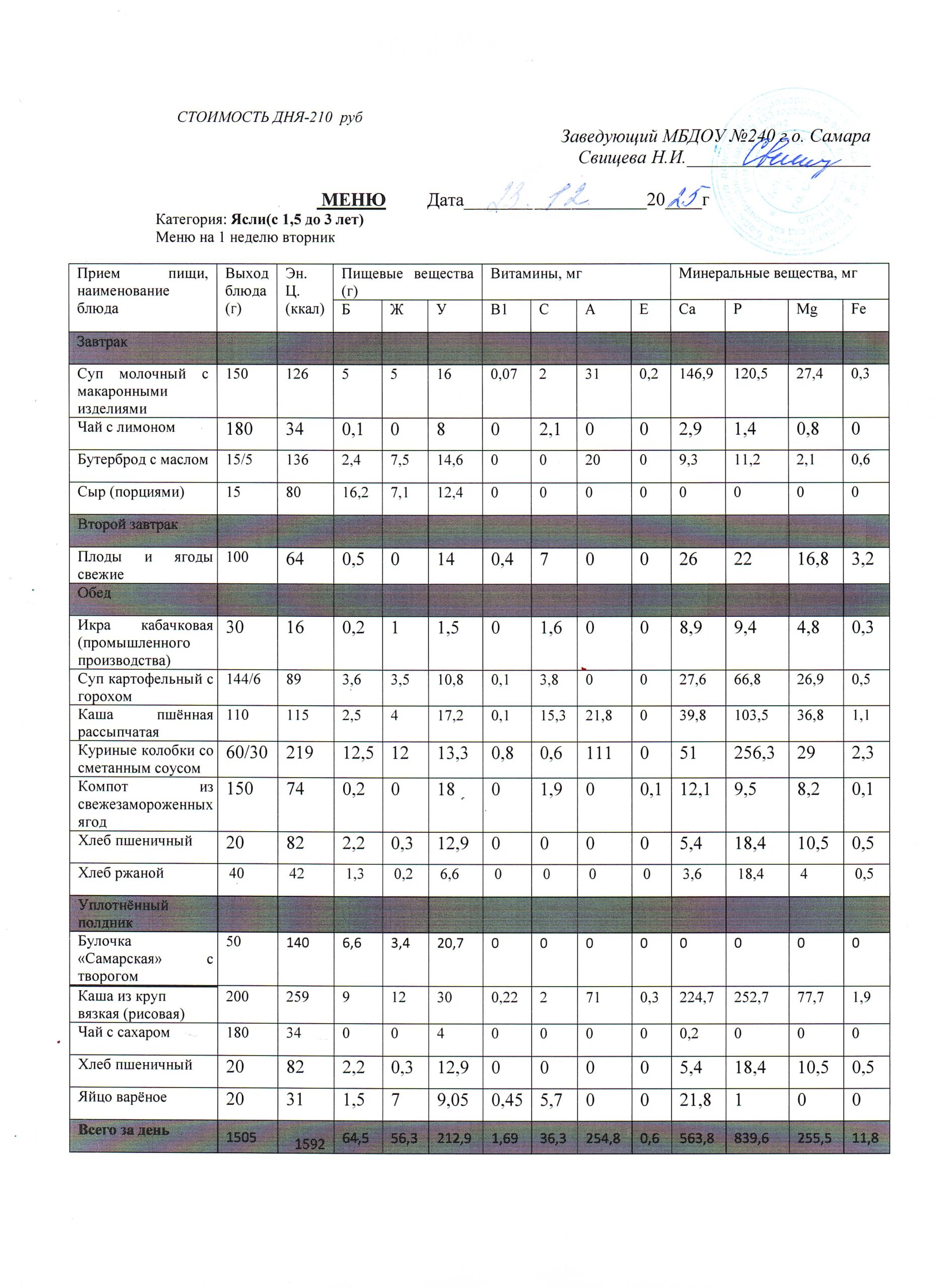 Питание в МБДОУ «Детский сад №240» г.о.Самара организовано в соответствии с примерным десятидневным меню, утвержденным руководителем ДОУ. Оно составлено с учетом основных пищевых веществ и калорийности. Питание детей включает:завтрак, второй завтрак (напиток или сок или свежие фрукты), обед, уплотненный полдник. В случае медицинских показаний у воспитанника, по заявлению родителя (законного представителя) может быть предоставлено индивидуальное питание.