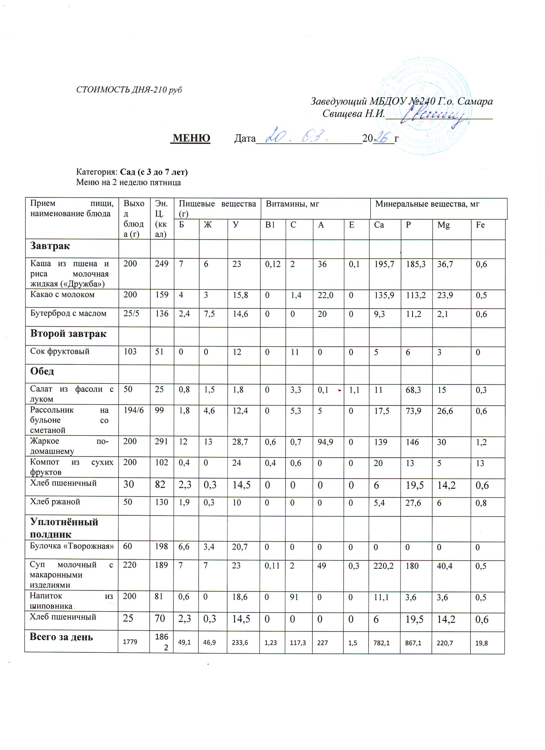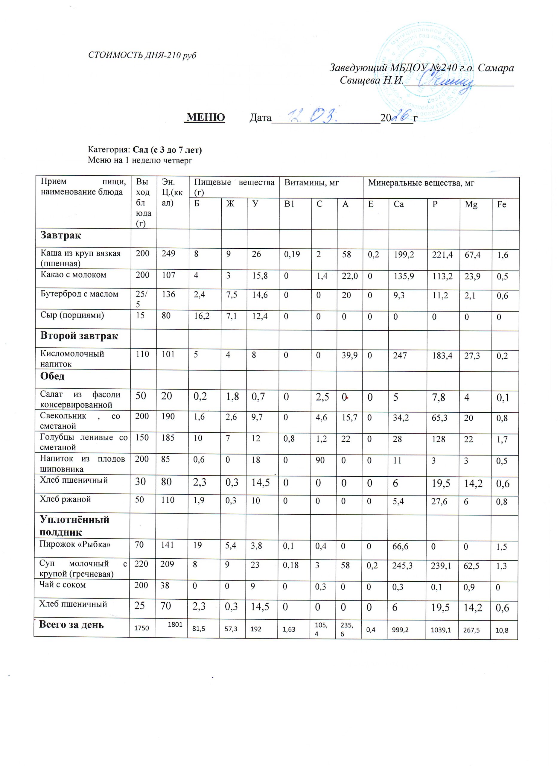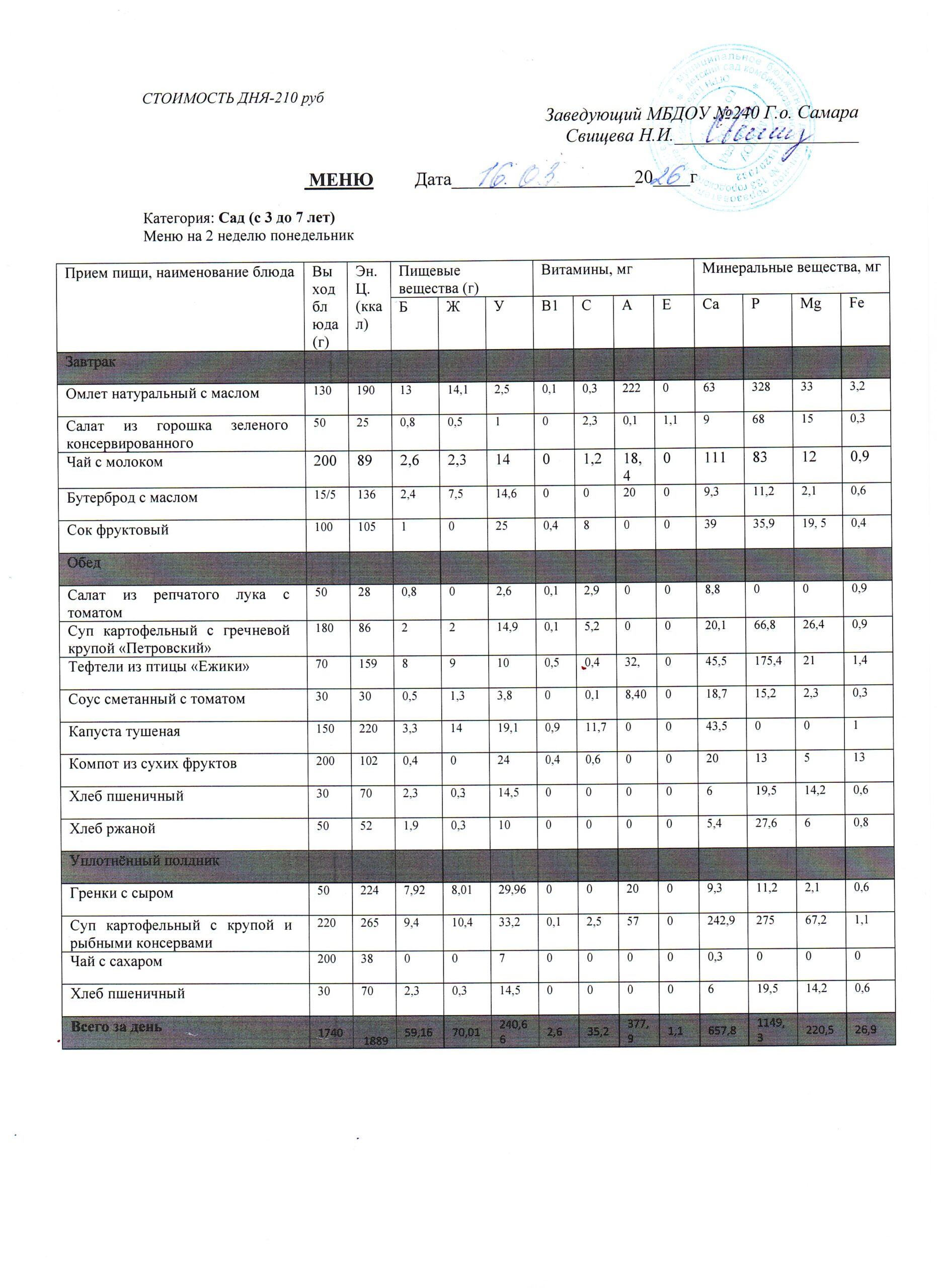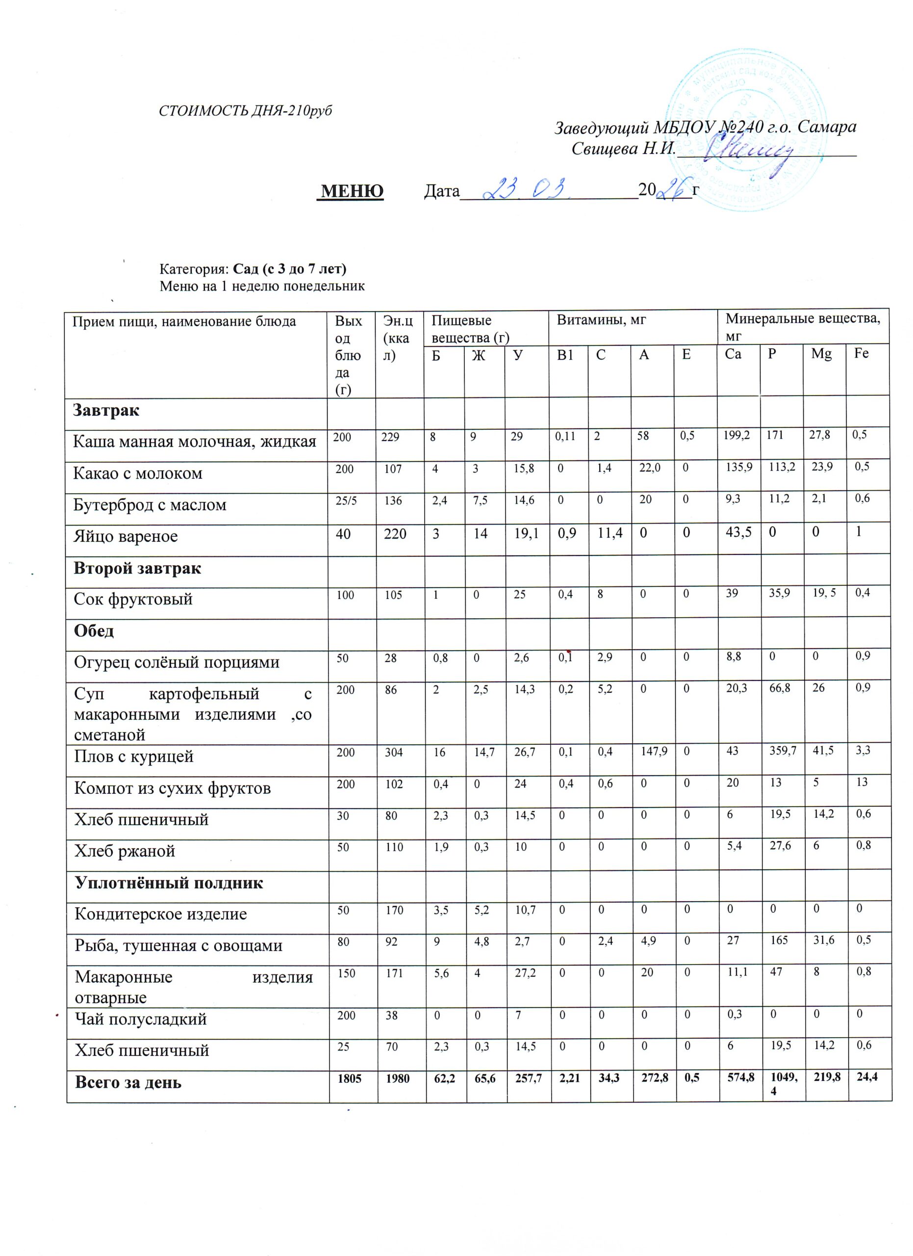 - Примерное цикличное меню (2-х недельное) весенне-летний сезон (3-7 лет)
